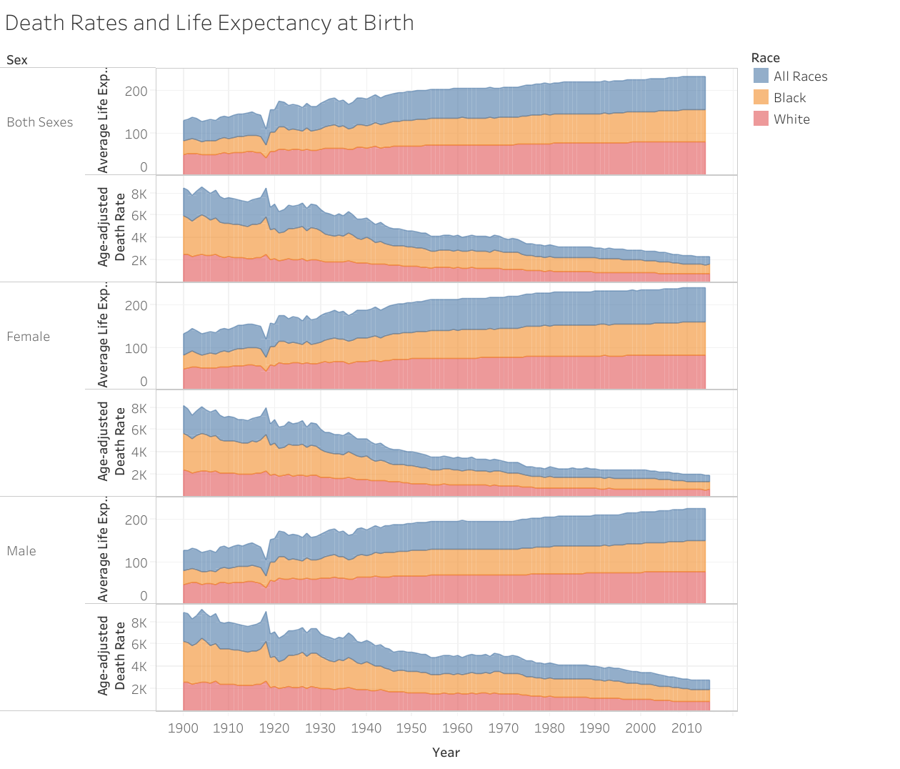 The data that was chosen and analyzed in the image below was retrieved from the Data.gov website where the data set from the National Center for Health Statistics concerning death rates and life expectancy at birth can be found. This analyzed data set displays the differences between the life expectancy and age-adjusted death rate by race and sex from the year 1900 to 2015. There are certainly trends that can be seen from the data that are interesting, yet not surprising, to be seen visualized in this way. The power given to this set of data by using a tool to display the data in such a meaningful way is irrefutable.
